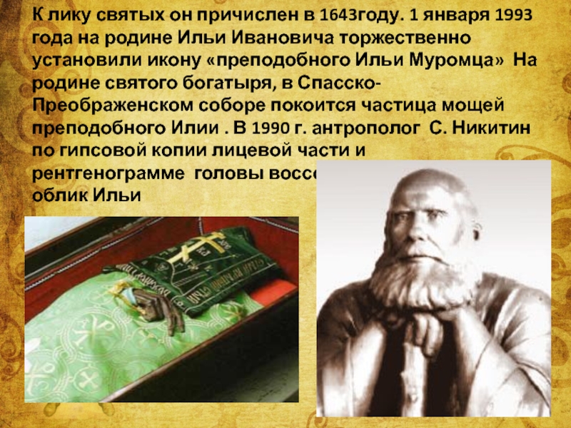 на родине Ильи Ивановича торжественно установили икону «преподобного Ильи Муромца» На родине святого богатыря, в Спасско- Преображенском соборе покоится частица мощей преподобного Илии . В 1990 г. антрополог С. Никитин по гипсовой копии лицевой части и рентгенограмме головы воссоздал