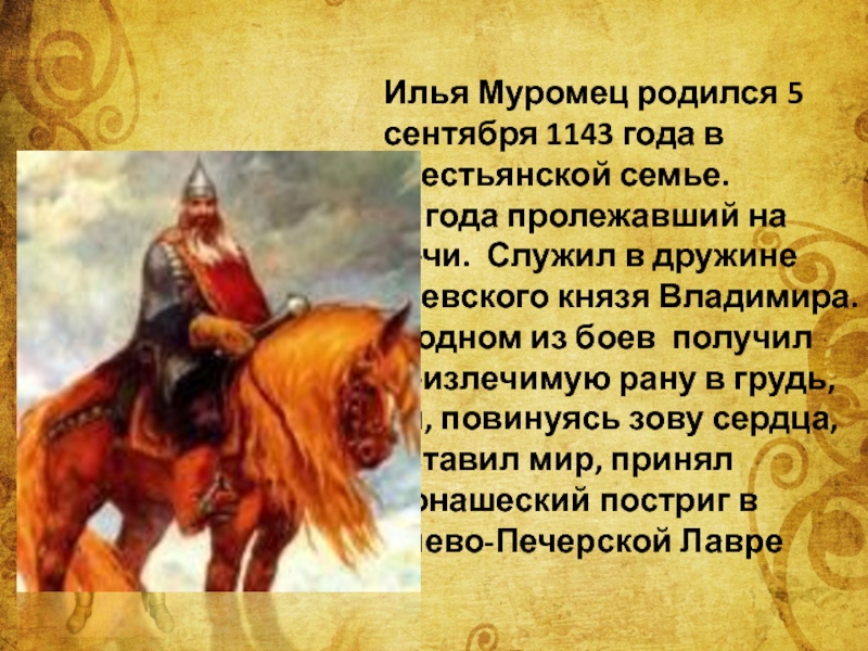 Слайд 8Илья Муромец родился 5 сентября 1143 года в крестьянской семье.