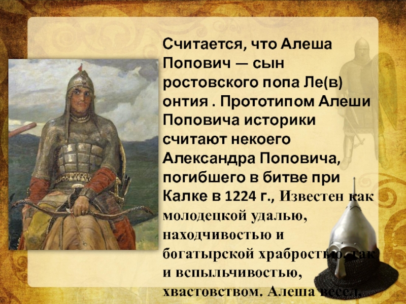 Слайд 12Считается, что Алеша Попович — сын ростовского попа Ле(в)онтия . Прототипом
