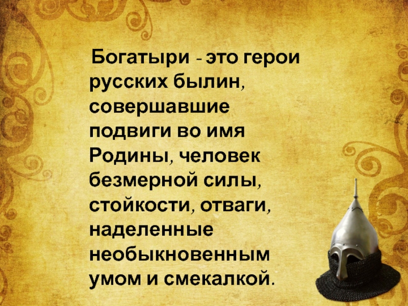 Слайд 5 Богатыри - это герои русских былин, совершавшие подвиги во имя