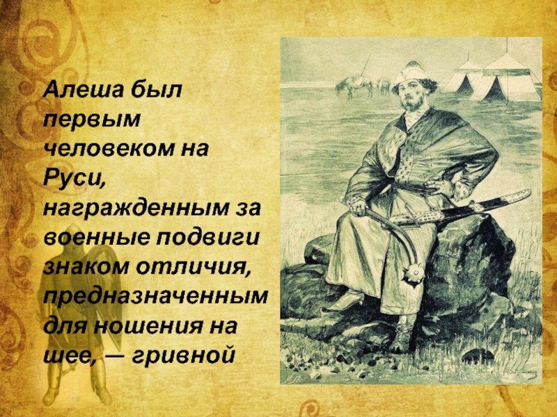 Слайд 13Алеша был первым человеком на Руси, награжденным за военные подвиги знаком