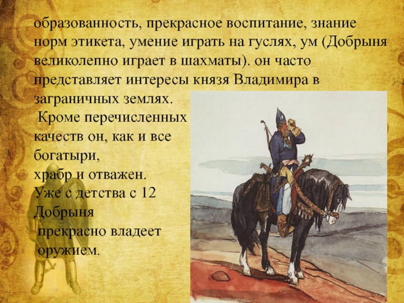 Слайд 11образованность, прекрасное воспитание, знание норм этикета, умение играть на гуслях, ум