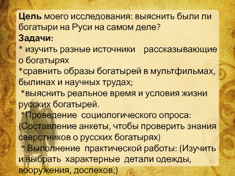 Слайд 2Цель моего исследования: выяснить были ли богатыри на Руси на самом