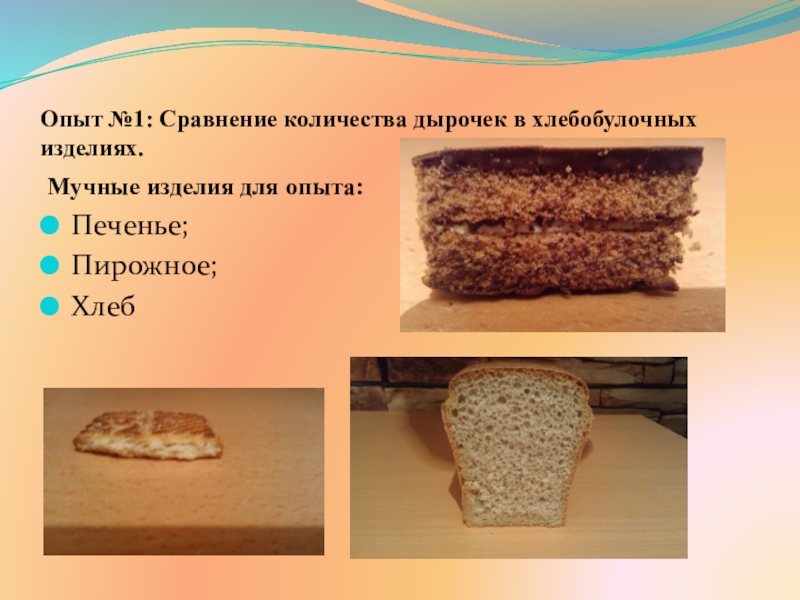 Слайд 13Опыт №1: Сравнение количества дырочек в хлебобулочных изделиях.
