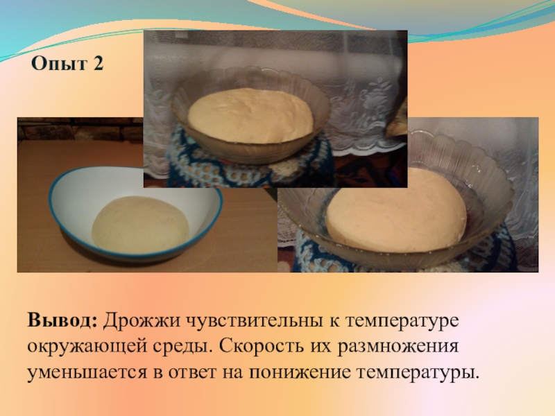 Вывод: Дрожжи чувствительны к температуре окружающей среды. Скорость
