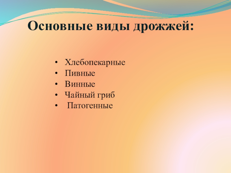 хлебопекарные, пивные, винные, чайный гриб, патогенные.