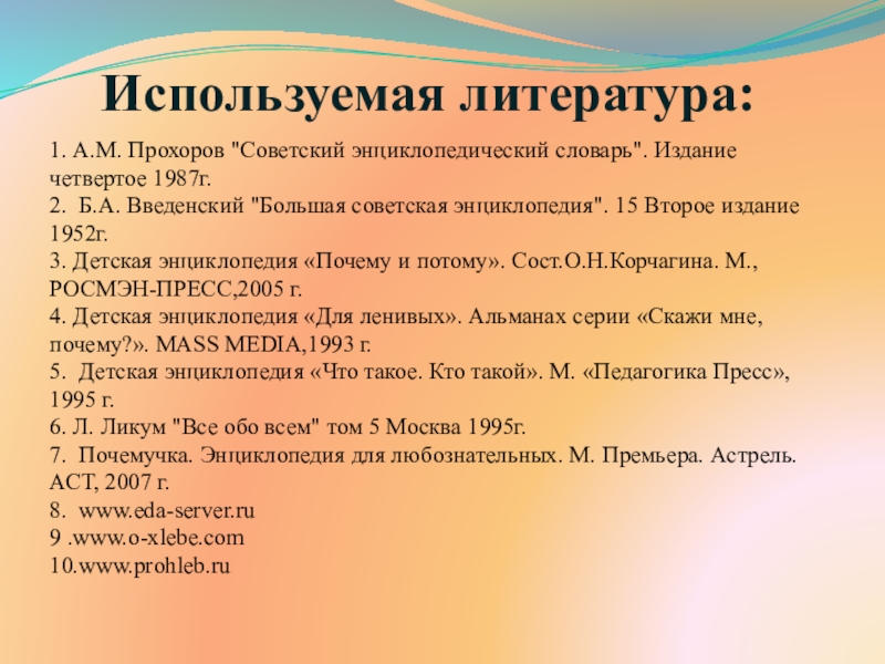 3. Детская энциклопедия «Почему и потому». Сост.О.Н.Корчагина. М., РОСМЭН-ПРЕСС,2005 г.