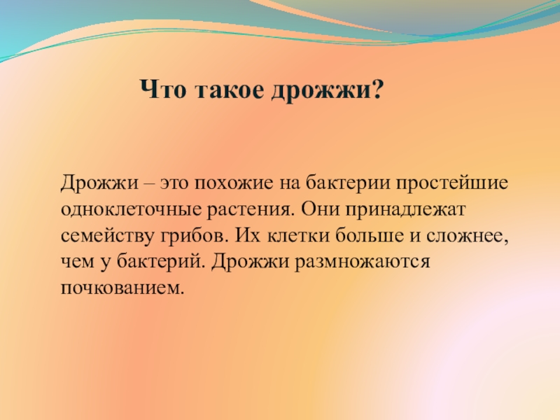 Они принадлежат семейству грибов. Их клетки больше и сложнее, чем у бактерий. Дрожжи размножаются почкованием.