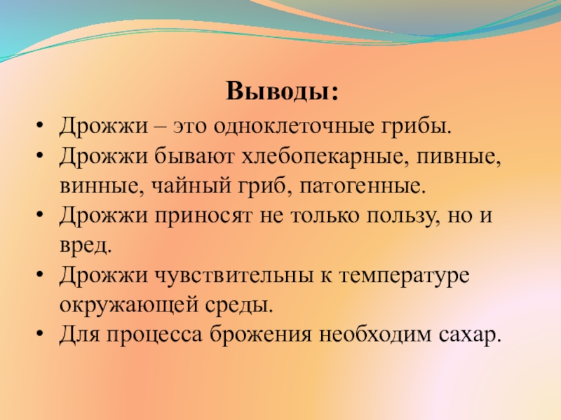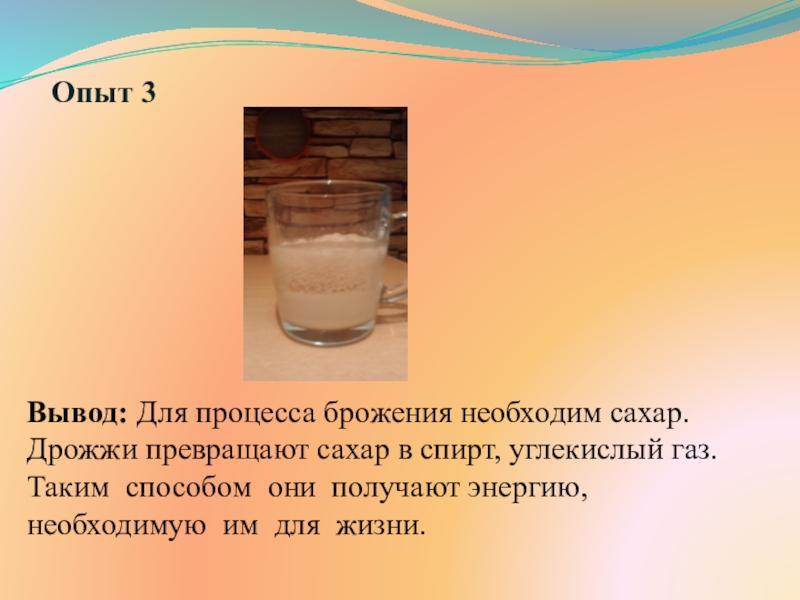Слайд 18Вывод: Для процесса брожения необходим сахар. Дрожжи превращают сахар в спирт,
