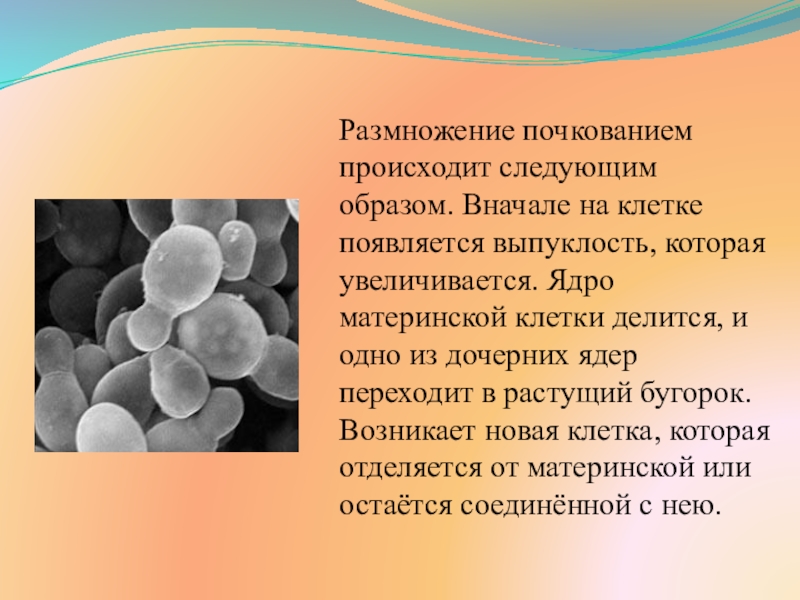 клетке появляется выпуклость, которая увеличивается. Ядро материнской клетки делится, и одно из дочерних ядер переходит в растущий бугорок. Возникает новая клетка, которая отделяется от материнской или остаётся соединённой с нею.