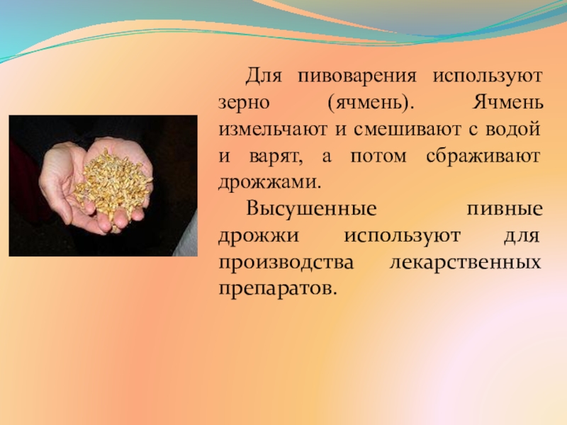 Слайд 9Для пивоварения используют зерно (ячмень). Ячмень измельчают и смешивают с водой