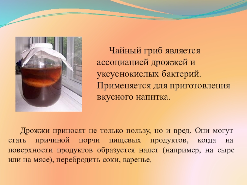 Слайд 11Чайный гриб является ассоциацией дрожжей и уксуснокислых бактерий. Применяется для приготовления