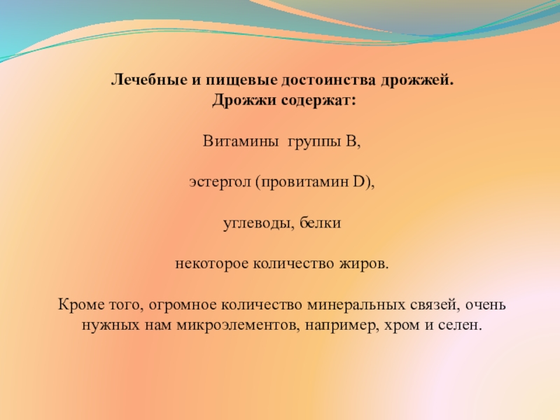 Слайд 6Лечебные и пищевые достоинства дрожжей.