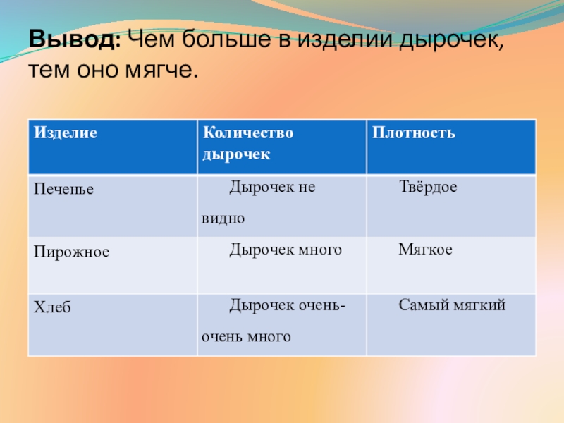Слайд 14Вывод: Чем больше в изделии дырочек, тем оно мягче.