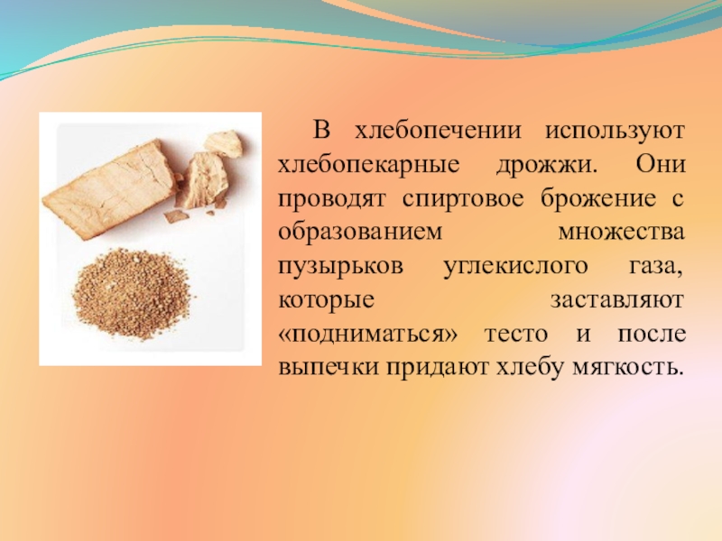 Слайд 8В хлебопечении используют хлебопекарные дрожжи. Они проводят спиртовое брожение с образованием