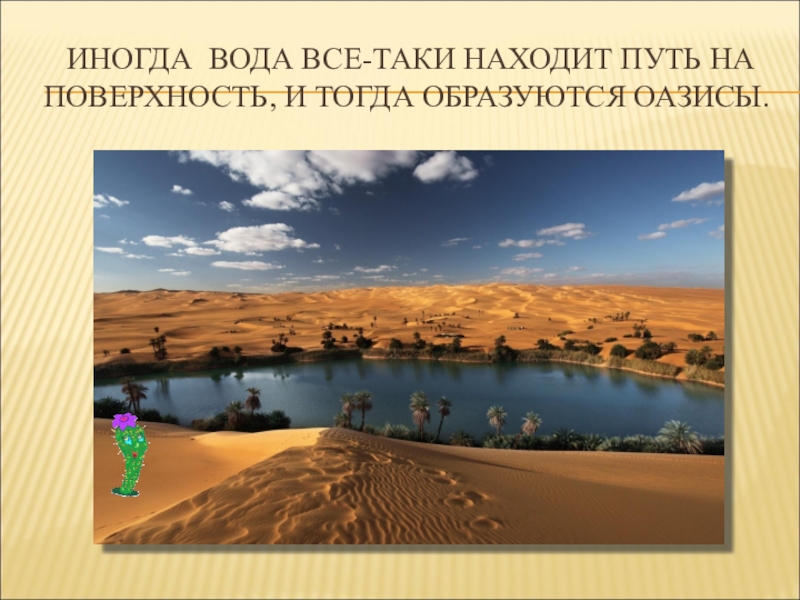 ИНОГДА ВОДА ВСЕ-ТАКИ НАХОДИТ ПУТЬ НА ПОВЕРХНОСТЬ, И ТОГДА ОБРАЗУЮТСЯ ОАЗИСЫ.