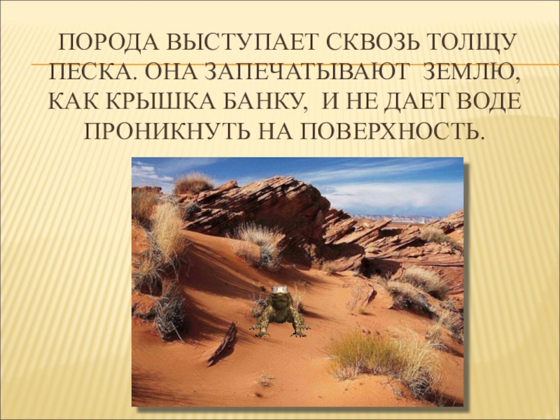 Слайд 9 ПОРОДА ВЫСТУПАЕТ СКВОЗЬ ТОЛЩУ ПЕСКА. ОНА ЗАПЕЧАТЫВАЮТ ЗЕМЛЮ, КАК КРЫШКА