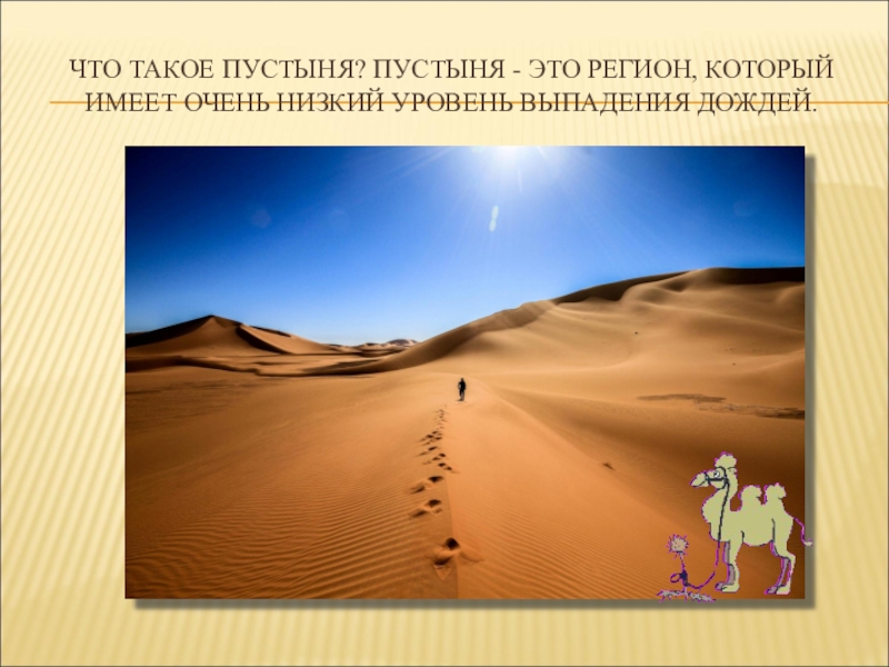 ЧТО ТАКОЕ ПУСТЫНЯ? ПУСТЫНЯ - ЭТО РЕГИОН, КОТОРЫЙ ИМЕЕТ ОЧЕНЬ НИЗКИЙ УРОВЕНЬ ВЫПАДЕНИЯ ДОЖДЕЙ.