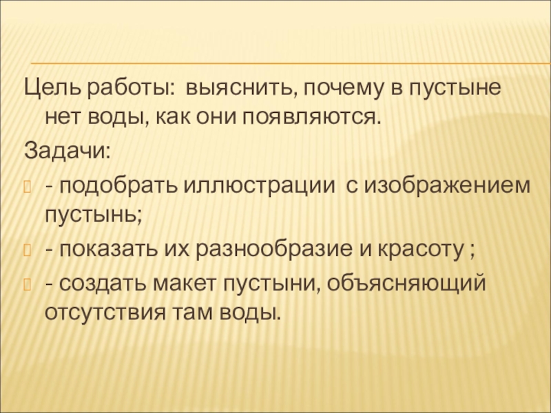 Цель работы: выяснить, почему в пустыне нет воды, как они появляются.Задачи:- подобрать иллюстрации с изображением пустынь;- показать их разнообразие и красоту ;- создать макет пустыни, объясняющий отсутствия там воды.