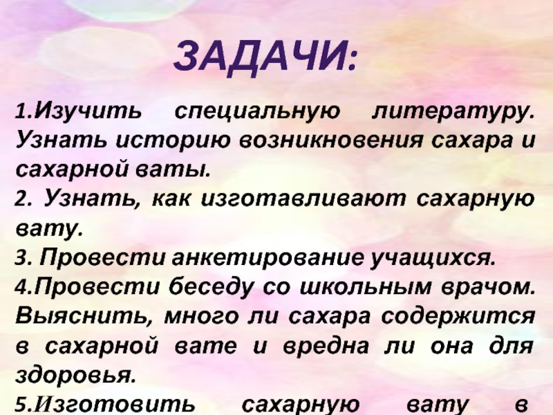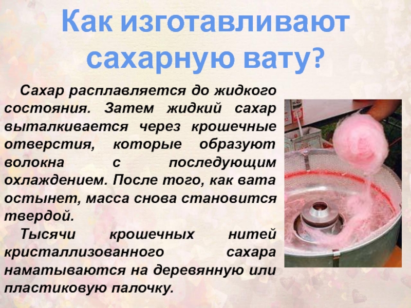1.Изучить специальную литературу. Узнать историю возникновения сахара и сахарной ваты.