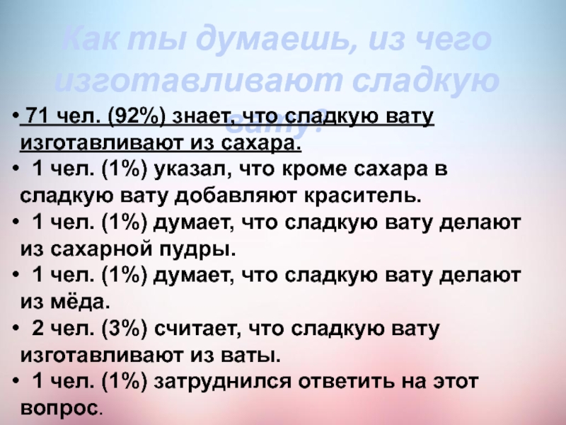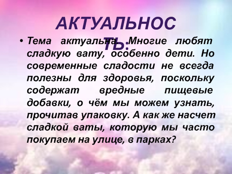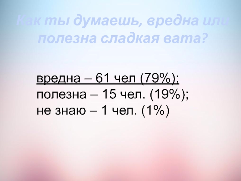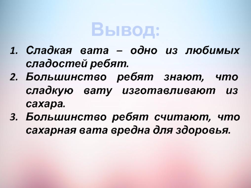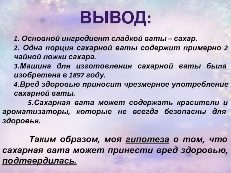 Таким образом, моя гипотеза о том, что сахарная вата может принести вред здоровью, подтвердилась.
