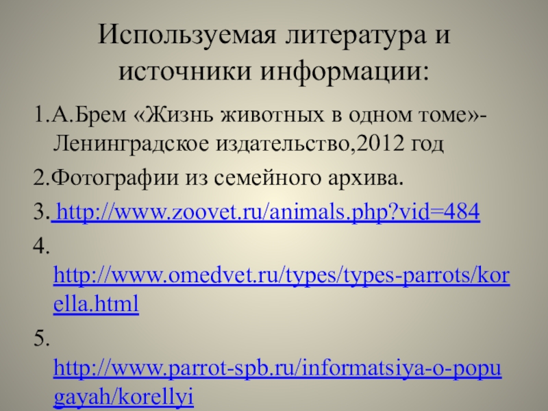 Используемая литература и источники информации:1.А.Брем «Жизнь животных в одном томе»-Ленинградское издательство,2012 год2.Фотографии из семейного архива.3. http://www.zoovet.ru/animals.php?vid=4844. http://www.omedvet.ru/types/types-parrots/korella.html5.