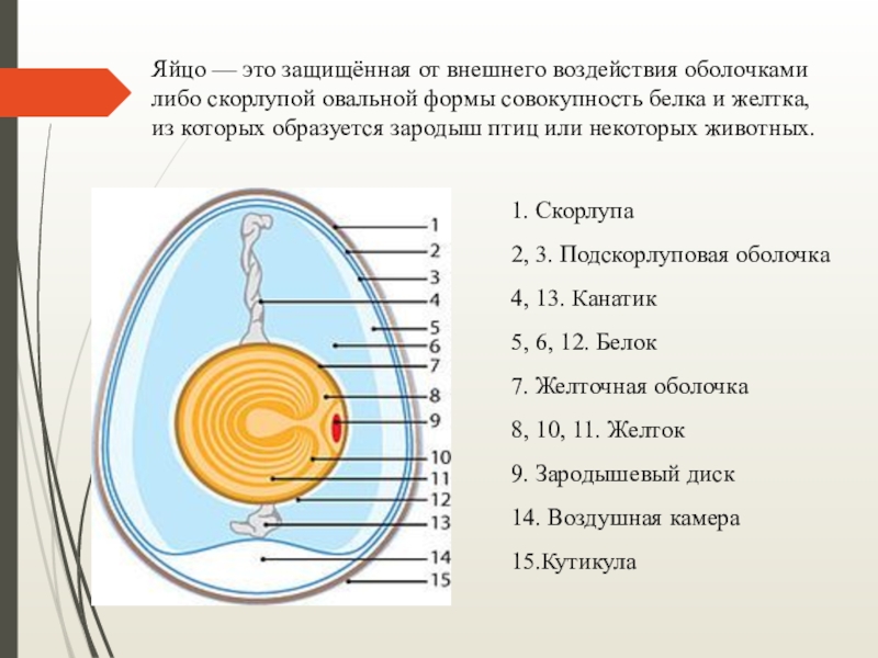 Яйцо — это защищённая от внешнего воздействия оболочками либо скорлупой овальной формы совокупность белка и желтка, из которых образуется зародыш птиц или некоторых животных.