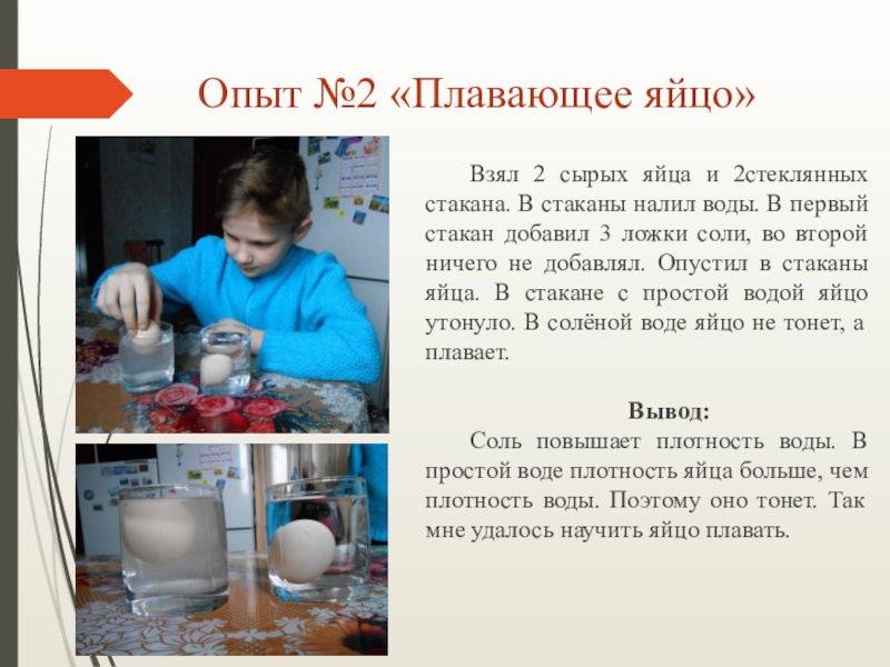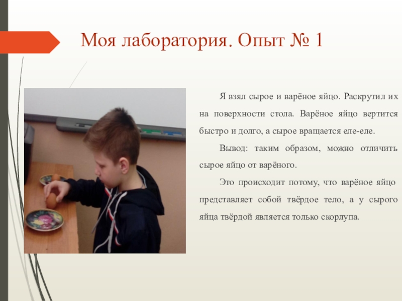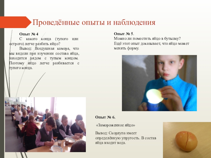 Вывод: Воздушная камера, что мы видели при изучении состава яйца, находится рядом с тупым концом. Поэтому яйцо легче разбивается с тупого конца.