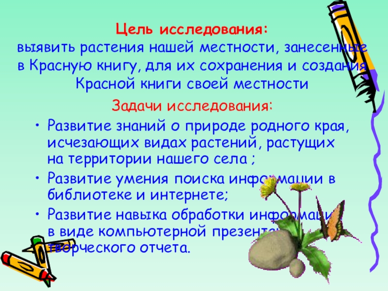 Развитие знаний о природе родного края, исчезающих видах растений, растущих на территории нашего села ;