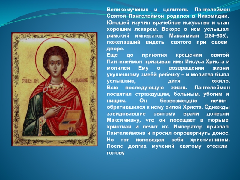 искусство и стал хорошим лекарем. Вскоре о нем услышал римский император Максимиан (284–305), пожелавший видеть святого при своем дворе.