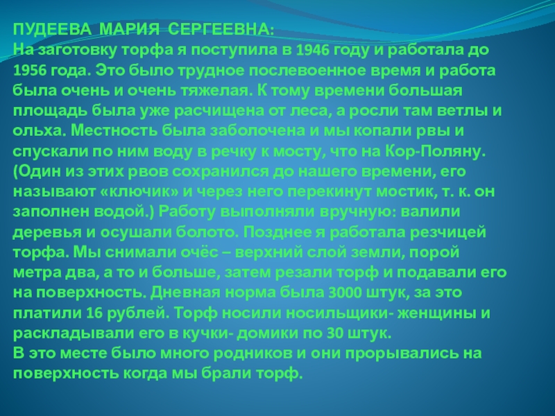 работала до 1956 года. Это было трудное послевоенное время и работа была очень и очень тяжелая. К тому времени большая площадь была уже расчищена от леса, а росли там ветлы и ольха. Местность была заболочена и мы копали рвы и спускали по ним воду в речку к мосту, что на Кор-Поляну. (Один из этих рвов сохранился до нашего времени, его называют «ключик» и через него перекинут мостик, т. к. он заполнен водой.) Работу выполняли вручную: валили деревья и осушали болото. Позднее я работала резчицей торфа. Мы снимали очёс – верхний слой земли, порой метра два, а то и больше, затем резали торф и подавали его на поверхность. Дневная норма была 3000 штук, за это платили 16 рублей. Торф носили носильщики- женщины и раскладывали его в кучки- домики по 30 штук.