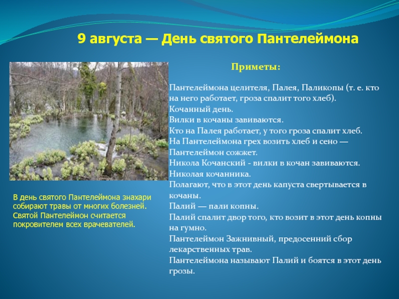 В день святого Пантелеймона знахари собирают травы от многих болезней. Святой Пантелеймон считается покровителем всех врачевателей.