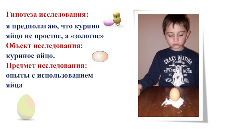 Объект исследования: куриное яйцо. Предмет исследования: опыты с использованием яйца
