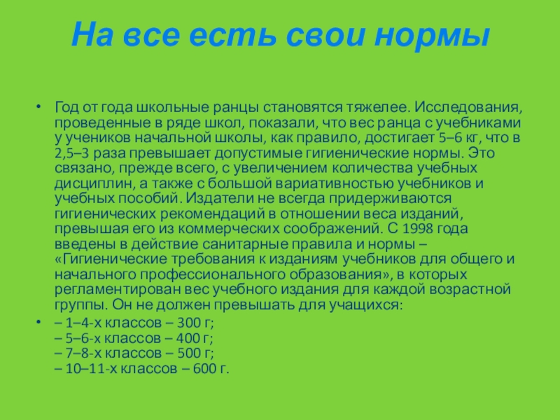 Исследования, проведенные в ряде школ, показали, что вес ранца с учебниками у учеников начальной школы, как правило, достигает 5–6 кг, что в 2,5–3 раза превышает допустимые гигиенические нормы. Это связано, прежде всего, с увеличением количества учебных дисциплин, а также с большой вариативностью учебников и учебных пособий. Издатели не всегда придерживаются гигиенических рекомендаций в отношении веса изданий, превышая его из коммерческих соображений. С 1998 года введены в действие санитарные правила и нормы – «Гигиенические требования к изданиям учебников для общего и начального профессионального образования», в которых регламентирован вес учебного издания для каждой возрастной группы. Он не должен превышать для учащихся: