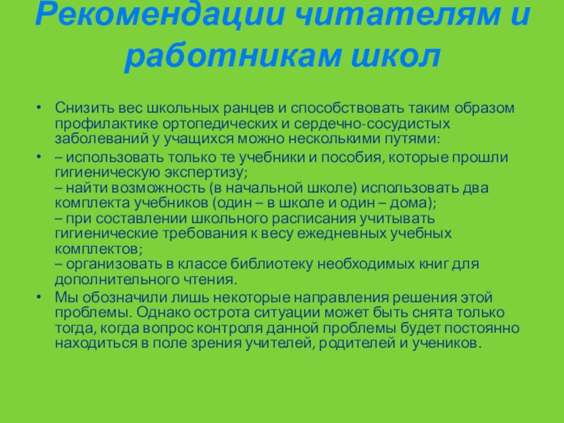 Мы обозначили лишь некоторые направления решения этой проблемы. Однако острота ситуации может быть снята только тогда, когда вопрос контроля данной проблемы будет постоянно находиться в поле зрения учителей, родителей и учеников.
