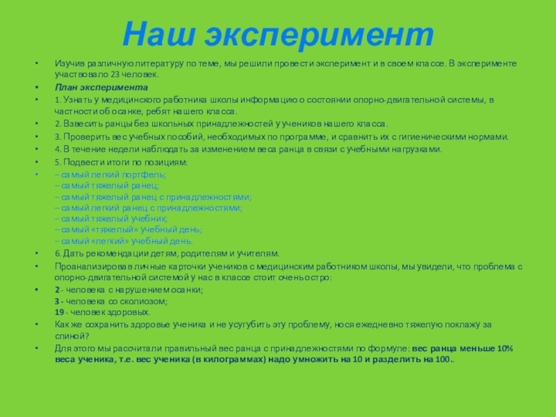 Для этого мы рассчитали правильный вес ранца с принадлежностями по формуле: вес ранца меньше 10% веса ученика, т.е. вес ученика (в килограммах) надо умножить на 10 и разделить на 100..