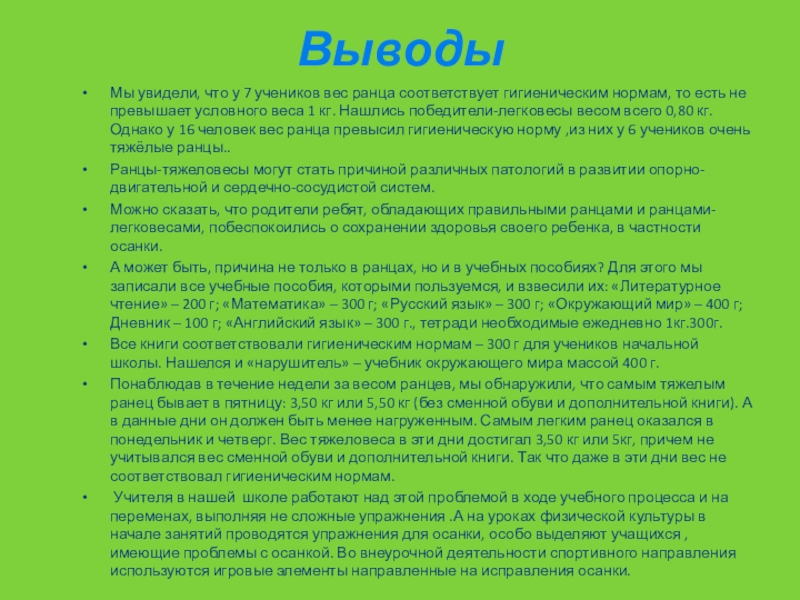 Понаблюдав в течение недели за весом ранцев, мы обнаружили, что самым тяжелым ранец бывает в пятницу: 3,50 кг или 5,50 кг (без сменной обуви и дополнительной книги). А в данные дни он должен быть менее нагруженным. Самым легким ранец оказался в понедельник и четверг. Вес тяжеловеса в эти дни достигал 3,50 кг или 5кг, причем не учитывался вес сменной обуви и дополнительной книги. Так что даже в эти дни вес не соответствовал гигиеническим нормам.