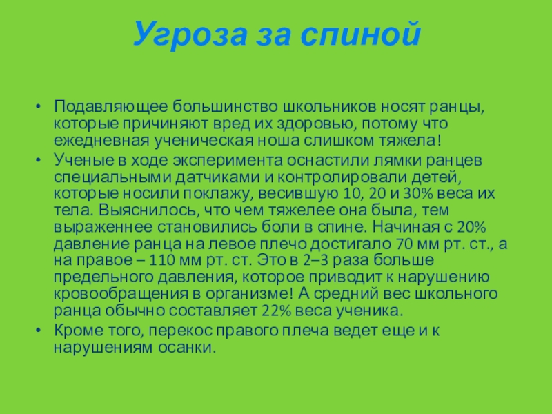 Ученые в ходе эксперимента оснастили лямки ранцев специальными датчиками и контролировали детей, которые носили поклажу, весившую 10, 20 и 30% веса их тела. Выяснилось, что чем тяжелее она была, тем выраженнее становились боли в спине. Начиная с 20% давление ранца на левое плечо достигало 70 мм рт. ст., а на правое – 110 мм рт. ст. Это в 2–3 раза больше предельного давления, которое приводит к нарушению кровообращения в организме! А средний вес школьного ранца обычно составляет 22% веса ученика.