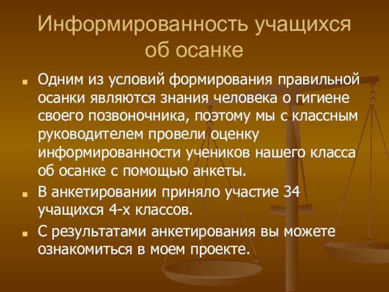 человека о гигиене своего позвоночника, поэтому мы с классным руководителем провели оценку информированности учеников нашего класса об осанке с помощью анкеты.