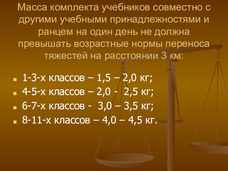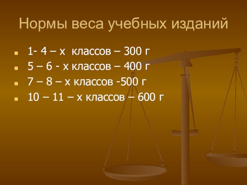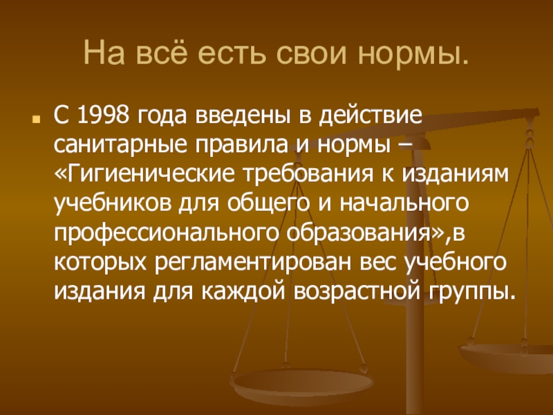 правила и нормы – «Гигиенические требования к изданиям учебников для общего и начального профессионального образования»,в которых регламентирован вес учебного издания для каждой возрастной группы.