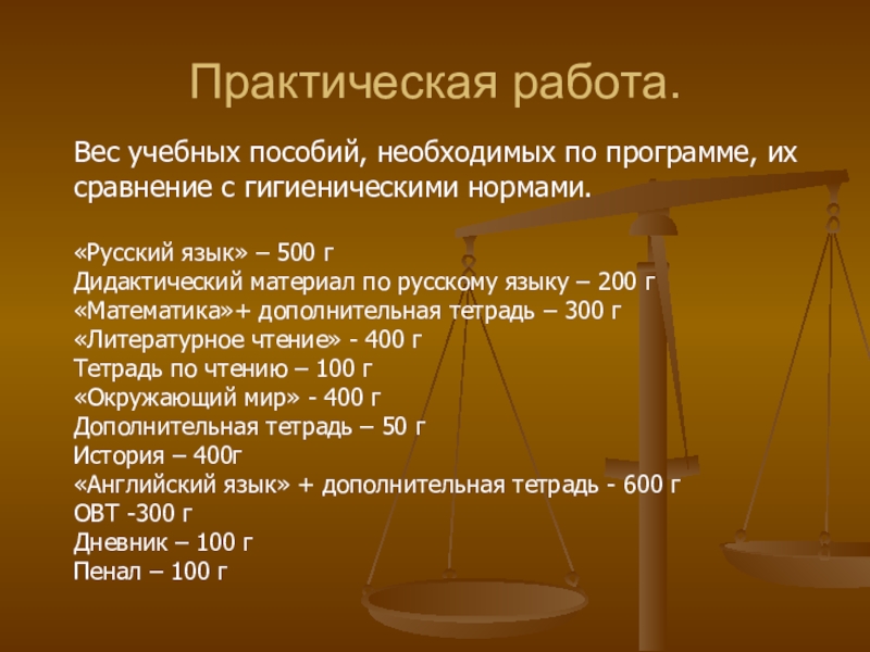 3. Проверить вес учебных пособий, необходимых по программе, и сравнить их с гигиеническими нормами.