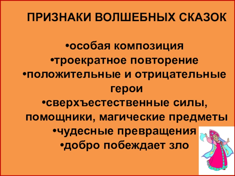 ПРИЗНАКИ ВОЛШЕБНЫХ СКАЗОКособая композициятроекратное повторениеположительные и отрицательные героисверхъестественные силы, помощники, магические предметычудесные превращениядобро побеждает зло