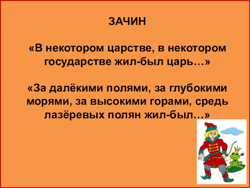 ЗАЧИН«В некотором царстве, в некотором государстве жил-был царь…»«За далёкими полями, за глубокими морями, за высокими горами, средь