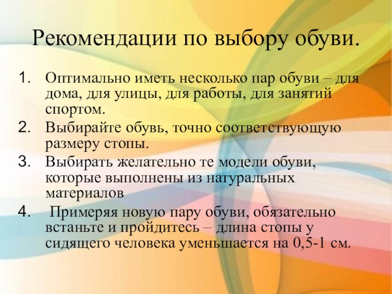 Рекомендации по выбору обуви.Оптимально иметь несколько пар обуви – для дома, для улицы, для работы, для занятий