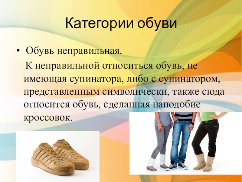 Категории обуви Обувь неправильная.  К неправильной относиться обувь, не имеющая супинатора, либо с супинатором, представленным символически,