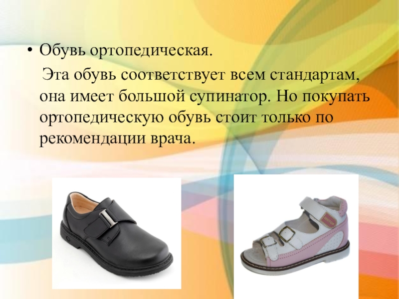 Обувь ортопедическая.   Эта обувь соответствует всем стандартам, она имеет большой супинатор. Но покупать ортопедическую обувь