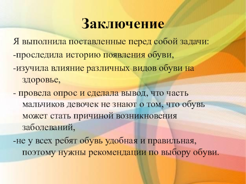 Заключение Я выполнила поставленные перед собой задачи: -проследила историю появления обуви,-изучила влияние различных видов обуви на здоровье,