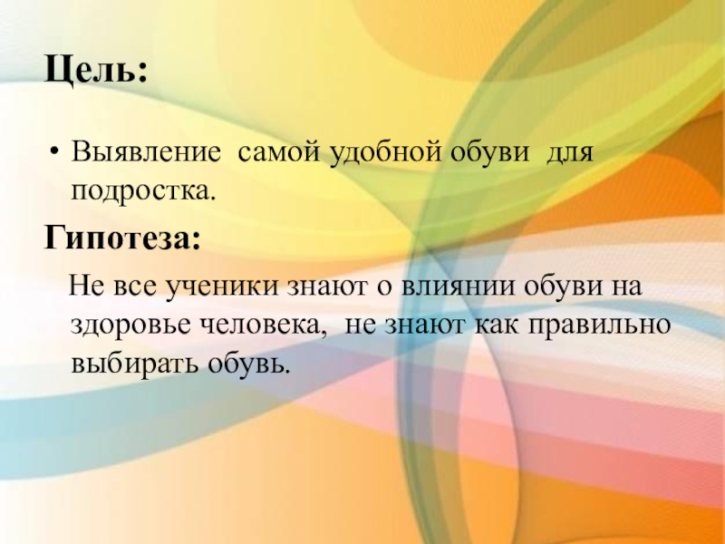 Цель:Выявление самой удобной обуви для подростка.Гипотеза: Не все ученики знают о влиянии обуви на здоровье человека, не знают как правильно выбирать обувь.