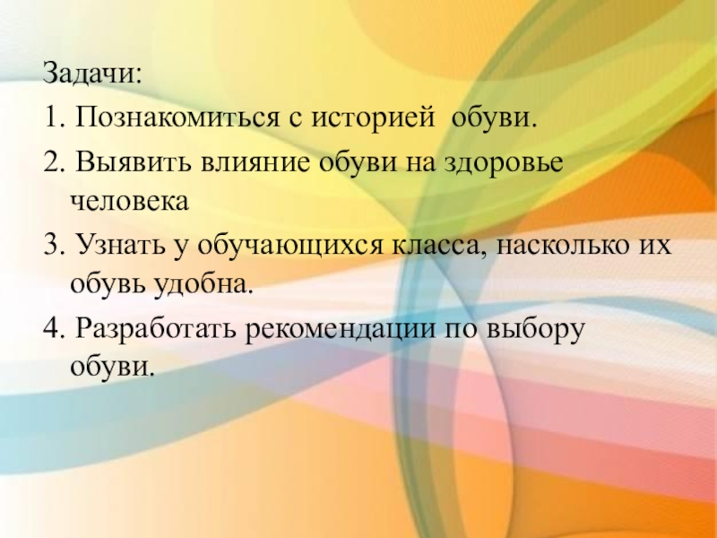 Задачи:1. Познакомиться с историей обуви.2. Выявить влияние обуви на здоровье человека3. Узнать у обучающихся класса, насколько их