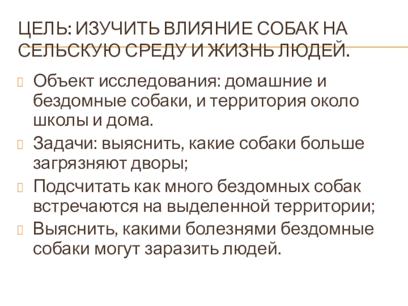 Слайд 4ЦЕЛЬ: ИЗУЧИТЬ ВЛИЯНИЕ СОБАК НА СЕЛЬСКУЮ СРЕДУ И ЖИЗНЬ ЛЮДЕЙ.